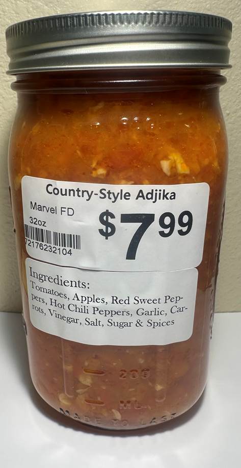 The recalled product is a tomato-based salsa called “Country Style Adjika.” It is canned in a 32oz glass jar, with the SKU# 72176232104 and produced January 2024-March 2026. Country Style Adjika was sold at Marvel Food and Deli locations and was not distributed outside of the stores.